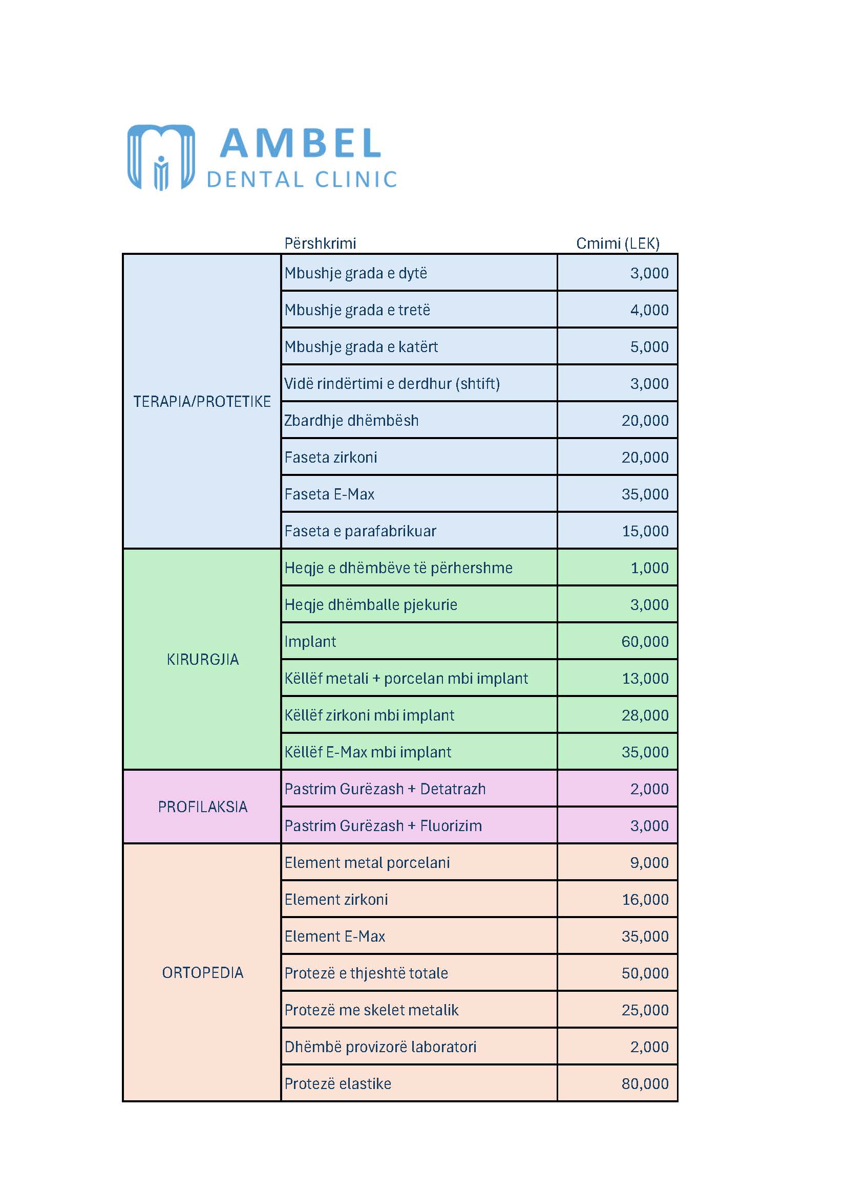 Heqje e dhëmbëve të përhershme/ dhëmballe pjekurie, implante, këllëf metali & porcelani/ këllëf zirkoni/ e-max, etj.